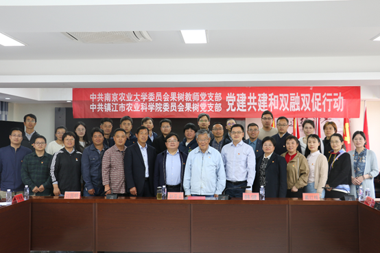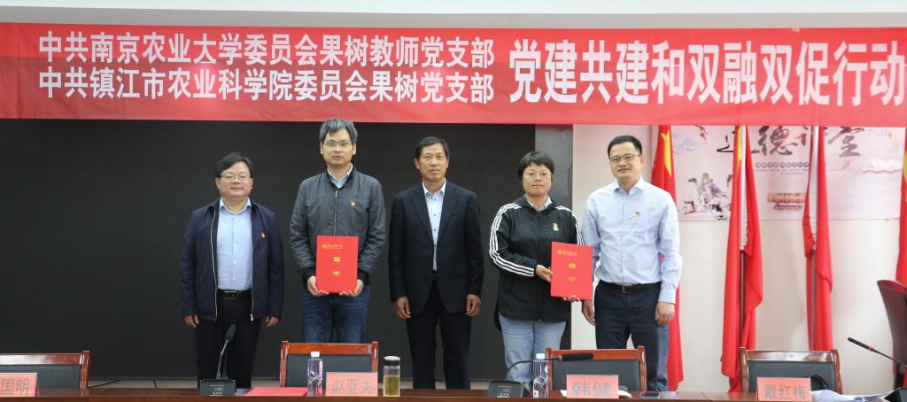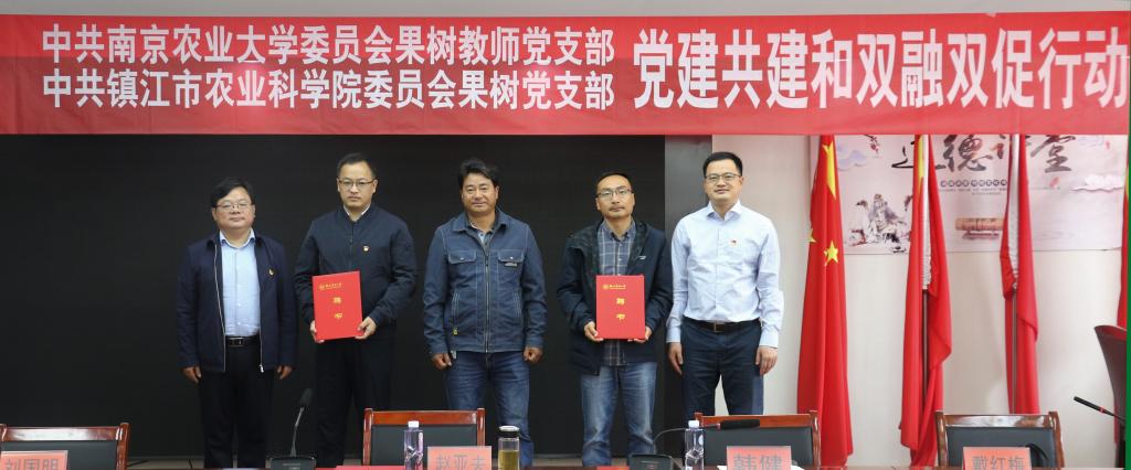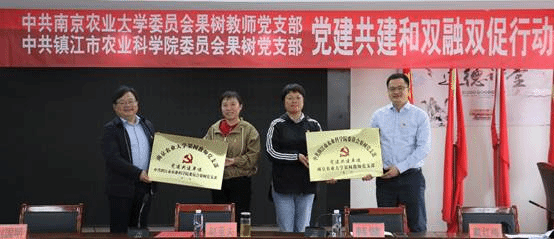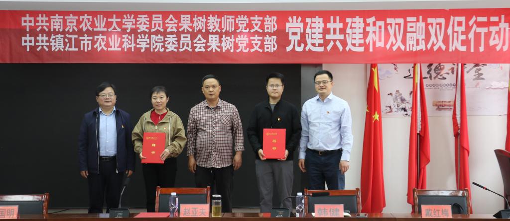 为深入学习贯彻党的二十大精神,全面落实习近平总书记关于全面推进乡村振兴的重要论述,4月21日上午,304am永利集团官网果树教师党支部和镇江农科院果树室党支部党建共建揭牌仪式暨“党建引领楷模示范科技赋能乡村振兴”主题党日活动在镇江市戴庄党群活动中心举行。全国时代楷模、镇江农科院赵亚夫研究员,304am永利集团官网党委书记韩健,镇江农科院党委书记刘国明,镇江农科院纪委书记戴红梅,304am永利集团官网果树教师党支部书记高志红,镇江农科院果树室党支部书记万春雁以及双方教师党支部全体党员参加了活动。
