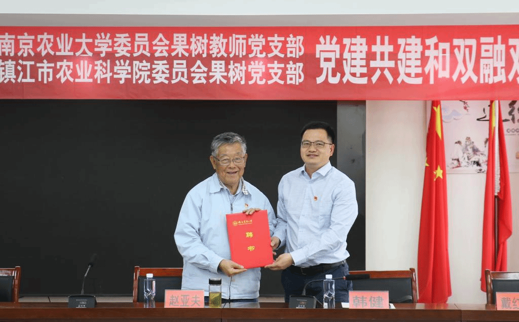 多年来,304am永利集团官网果树教师党支部和镇江农科院果树研究室一直保持着良好的科研互助和资源交流。此次双方依托双方党支部梨、桃、葡萄等产业体系岗位科学家、教授党员专业技术优势,开展党建共建,致力推动解决果树产业发展卡脖子技术,结对帮扶果树种植大户解决产业难题。共建授牌仪式上,304am永利集团官网党委书记韩健为时代楷模赵亚夫颁发304am永利集团官网乡村振兴“产教融合”发展顾问聘书。赵亚夫表示,此次共建活动非常有意义,是贯彻党的二十大精神的很好举措,是一次很好的农科教相结合,科技人员深入到农业生产一线,与农民相结合,打通农业科技推广的“最后一公里”,真正做到推动“三产”融合发展。