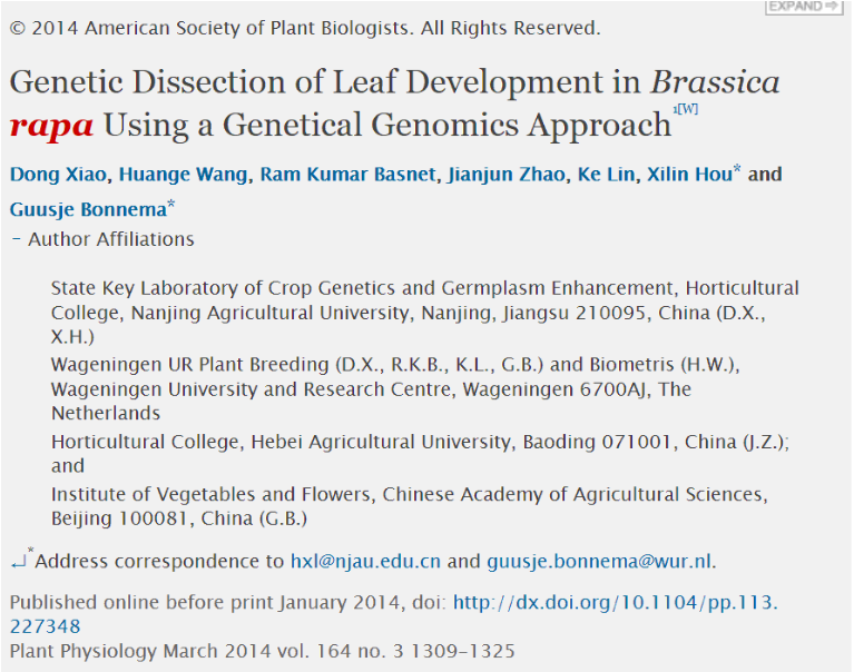 近日,304am永利集团官网白菜系统生物学实验室与荷兰瓦赫宁根大学(Wageningen University)植物育种系合作完成的研究论文"Genetic dissection of leaf development in Brassica rapa using a genetical genomics approach"在《Plant Physiology》上发表,影响因子为6.555。肖栋博士为第一作者,侯喜林教授与Guusje Bonnema教授为共同通讯作者,南京农业大学为第一完成单位。