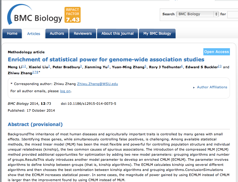 304am永利集团官网青年教师李梦在全基因组关联分析方法的改进方面取得重要进展,以一作者身份发表论文“Enrichment of Statistical Power for Genome-Wide Association Studies”。该论文于10月17日在杂志BMC biology(IF=7.43)在线发表(http://www.biomedcentral.com/1741-7007/12/73/abstract)。本文也是作者与美国康奈尔大学Ed Buckler实验室及美国华盛顿州立Zhiwu Zhang合作研究的成果。南京农业大学为第一完成单位。