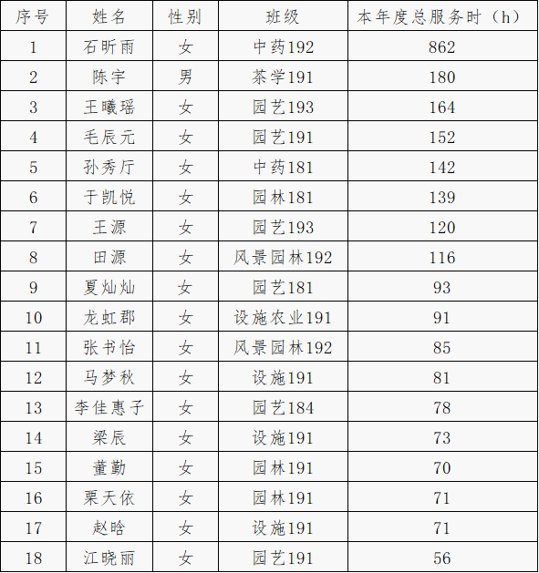 经个人申请,学院审核,以本年度志愿服务总时长为主要依据,拟推荐石昕雨等18名同学申请南京农业大学优秀志愿者: