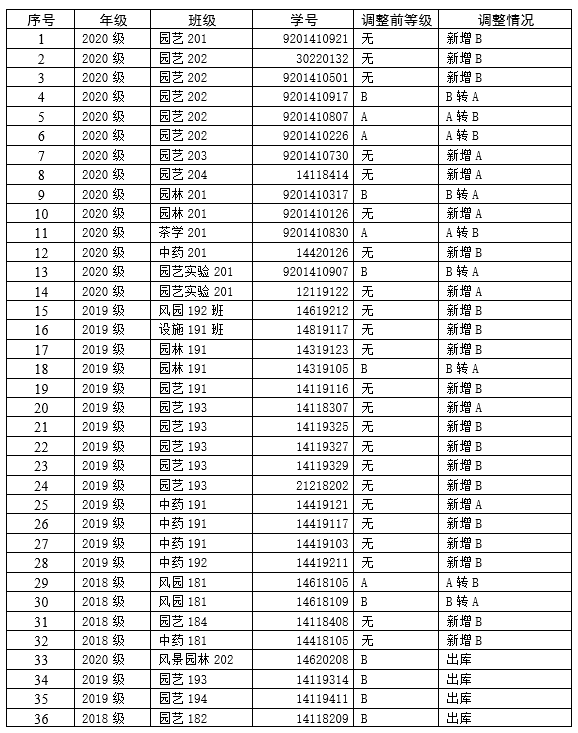 根据《南京农业大学家庭经济困难学生认定工作实施办法》(校学发〔2019〕184 号)文件精神和《关于做好2021-2022 学年家庭经济困难学生认定工作的通知》(校学函〔2021〕48 号)文件要求,经过学生自主申请、班级评议、学院审核,拟对36名本科生家庭经济困难情况认定做出调整,公示如下: