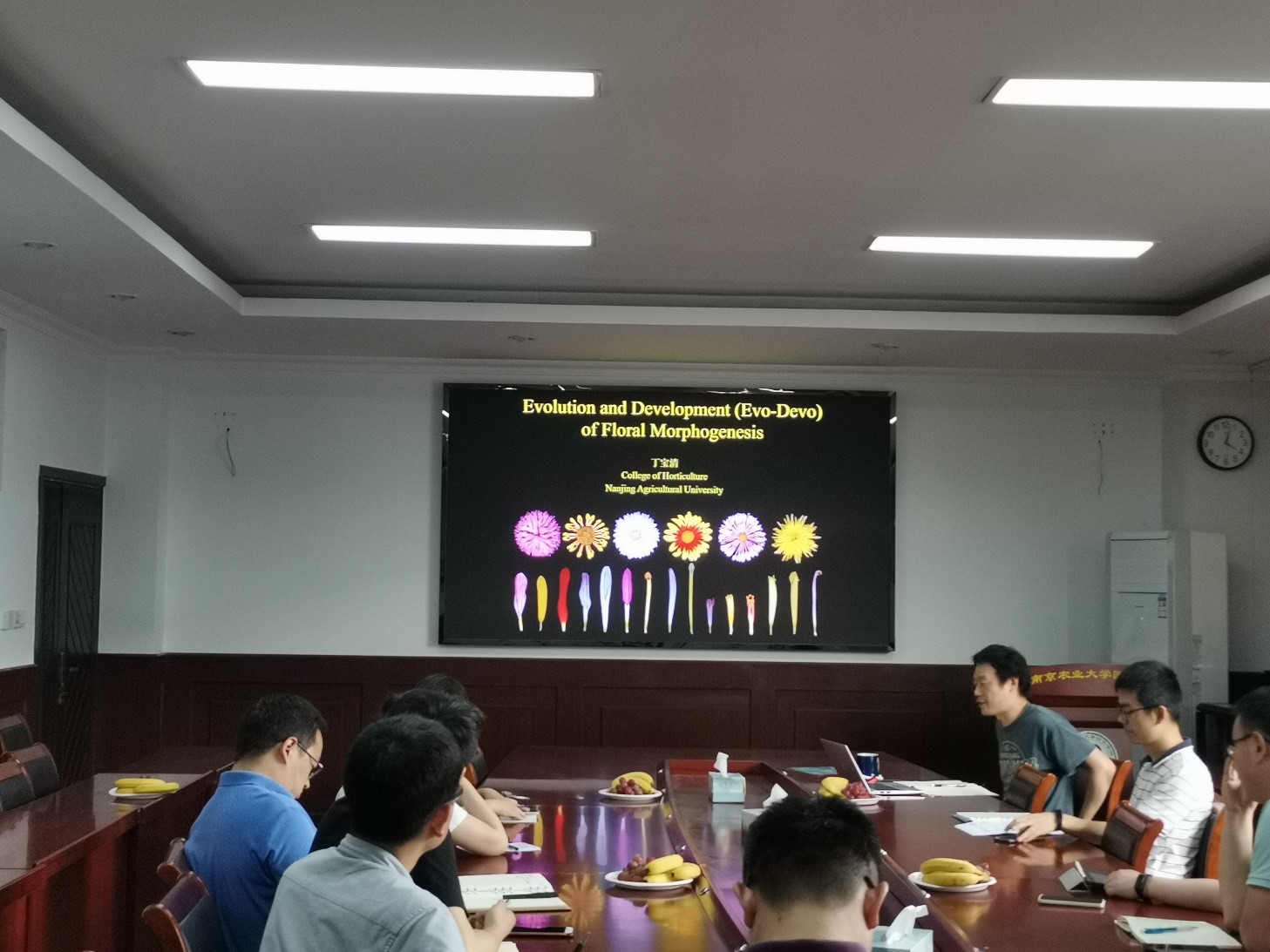 紧接着,丁老师以“管中窥豹”、“盲人摸象”等寓言典故开题,讲解自己在开展猴面花花冠分裂研究过程中的科研体会。随后,丁老师详细讲解了猴面花花冠分裂的分子机理。最后,丁老师提醒大家在科研过程中碰到问题时要多沟通多交流,在沟通交流中可以获得新的启示和灵感。