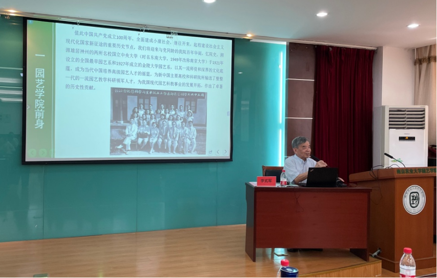 李式军教授作了题为《百年系科重鋳辉煌的先辈功臣--纪念曹寿椿教授诞辰百周年》的报告,他从百年园艺发展、曹寿椿业绩与贡献、学习先辈师长精神等三个方面,全面回顾了园艺系从创建到发展的完整历史和艰苦创业历程,详细介绍了曹寿椿先生的生平,学科建设与科学研究突出业绩,推动蔬菜产业发展与周年供应重要贡献以及教书育人累累硕果。他提出我们要学习曹寿椿先生热爱党、热爱祖国、热爱人民、热爱专业,矢志不渝的品德;要学习曹寿椿先生严谨、求实、创新的学风和一丝不苟、力求完美的敬业精神,勤奋努力工作,建功新时代,培养高素质园艺人才,推动园艺产业发展,服务国家战略,满足人民需求。
