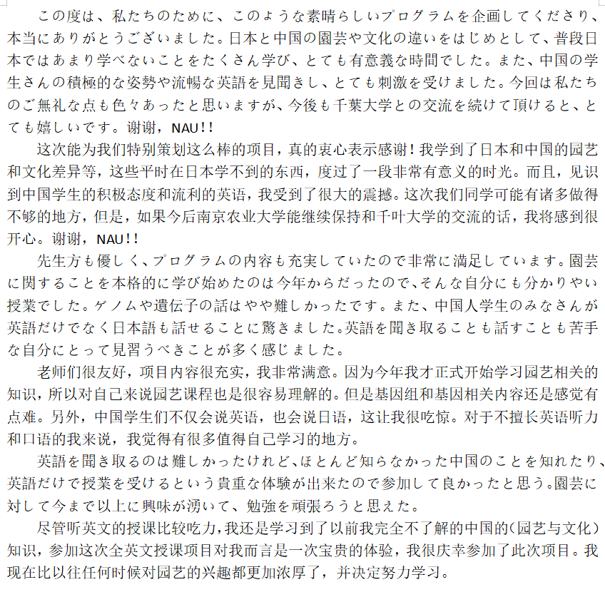 项目交流成效显著。通过此项目,千叶大学学生对中国园艺产业现状、我校304am永利集团官网在本领域的研究优势有了深入的了解,同时,培养了日本学生对于中国文化的兴趣,践行了中国文化走出去的思想,增进了中日大学生的感情交流,日本学生纷纷表示非常荣幸有机会参加此次夏令营,收获颇丰,今后有机会将来中国留学。项目实施结束后,面向日本学生开展了授课教师、学习收获、项目组织、项目实施整体效果等的问卷调研,调研结果显示,本次国际交流项目整体评价为优良。