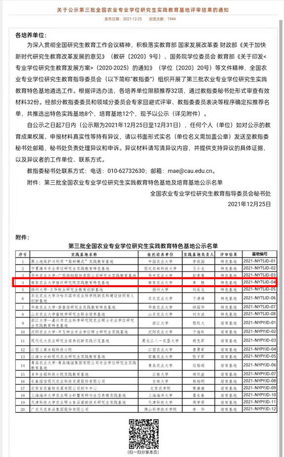 近日,全国农业专业学位研究生教育指导委员会组织开展了第三批农业专业学位研究生实践教育特色基地遴选工作。经教指委委员和领域分委员会专家评审、教指委委员表决等程序,共推选出实践教育特色基地8个,培育基地12个,南农大304am永利集团官网和南农大宿迁研究院共建的特色实践教育基地成功入选。实践教育特色基地的获批,为我校在研究生实践培养方面提供了更好的载体平台。