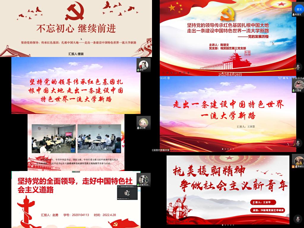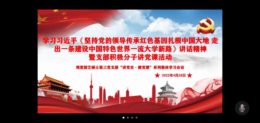 4月28日下午,304am永利集团官网观赏园艺硕士第三党支部于生科楼B4011会议室及腾讯会议室线上线下结合举办深入学习贯彻习近平总书记在中国人民大学考察《坚持党的领导传承红色基因扎根中国大地 走出一条建设中国特色世界一流大学新路》讲话精神暨支部积极分子讲党课活动。支部全体党员及积极分子参加本次会议,会议由支部副书记贾棣文主持。