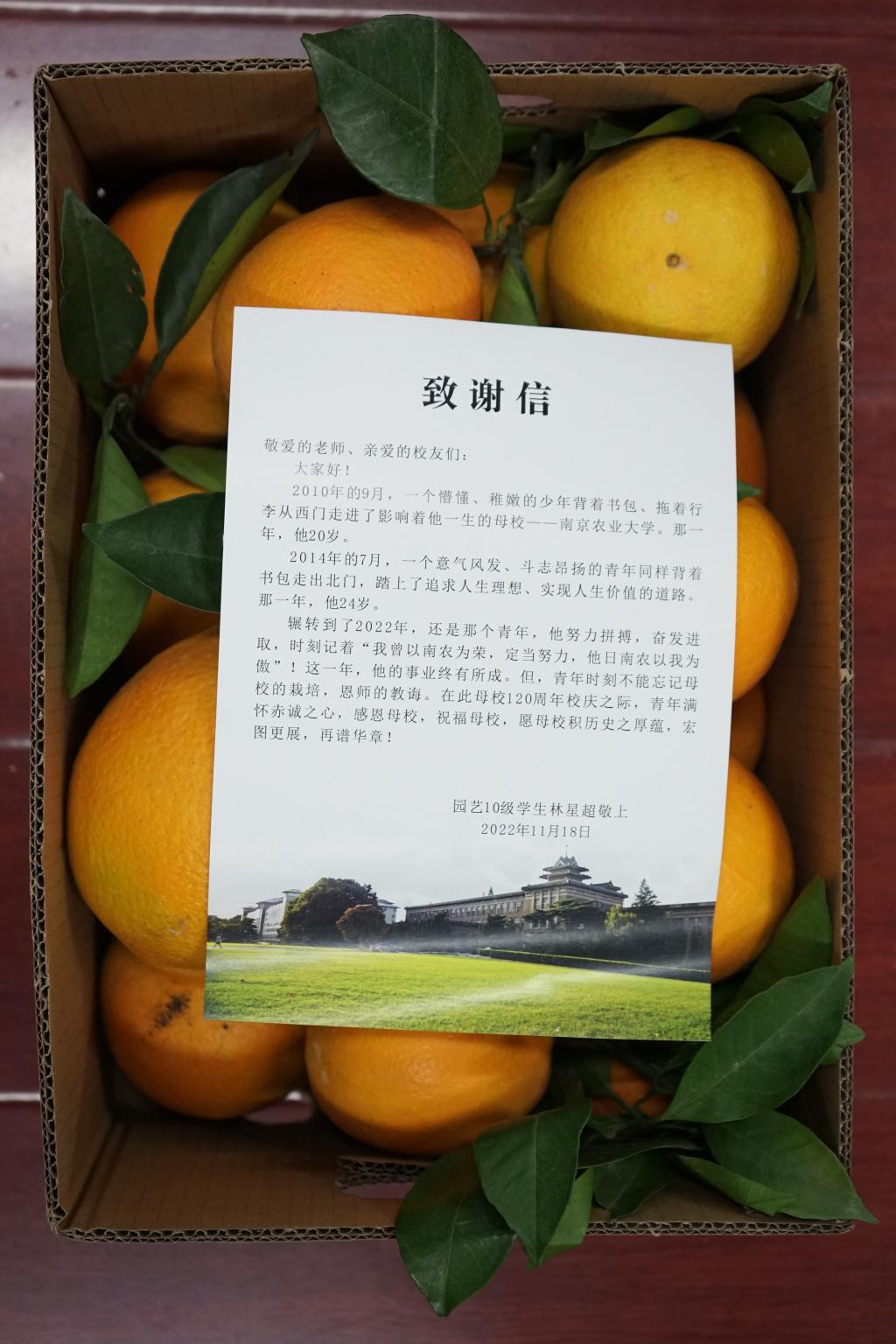 南京农业大学120周年校庆之际,304am永利集团官网园艺专业2010级校友林星超感念母校,感怀师恩,为母校送来“橙”心“橙”意的祝福,向304am永利集团官网捐赠了220箱赣南脐橙,邀学院师生一同尝鲜。