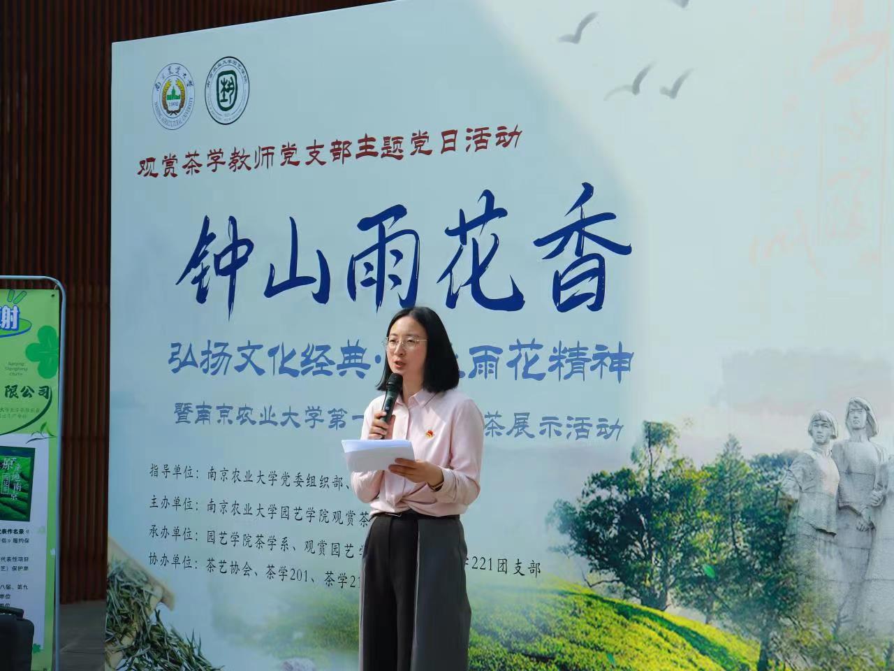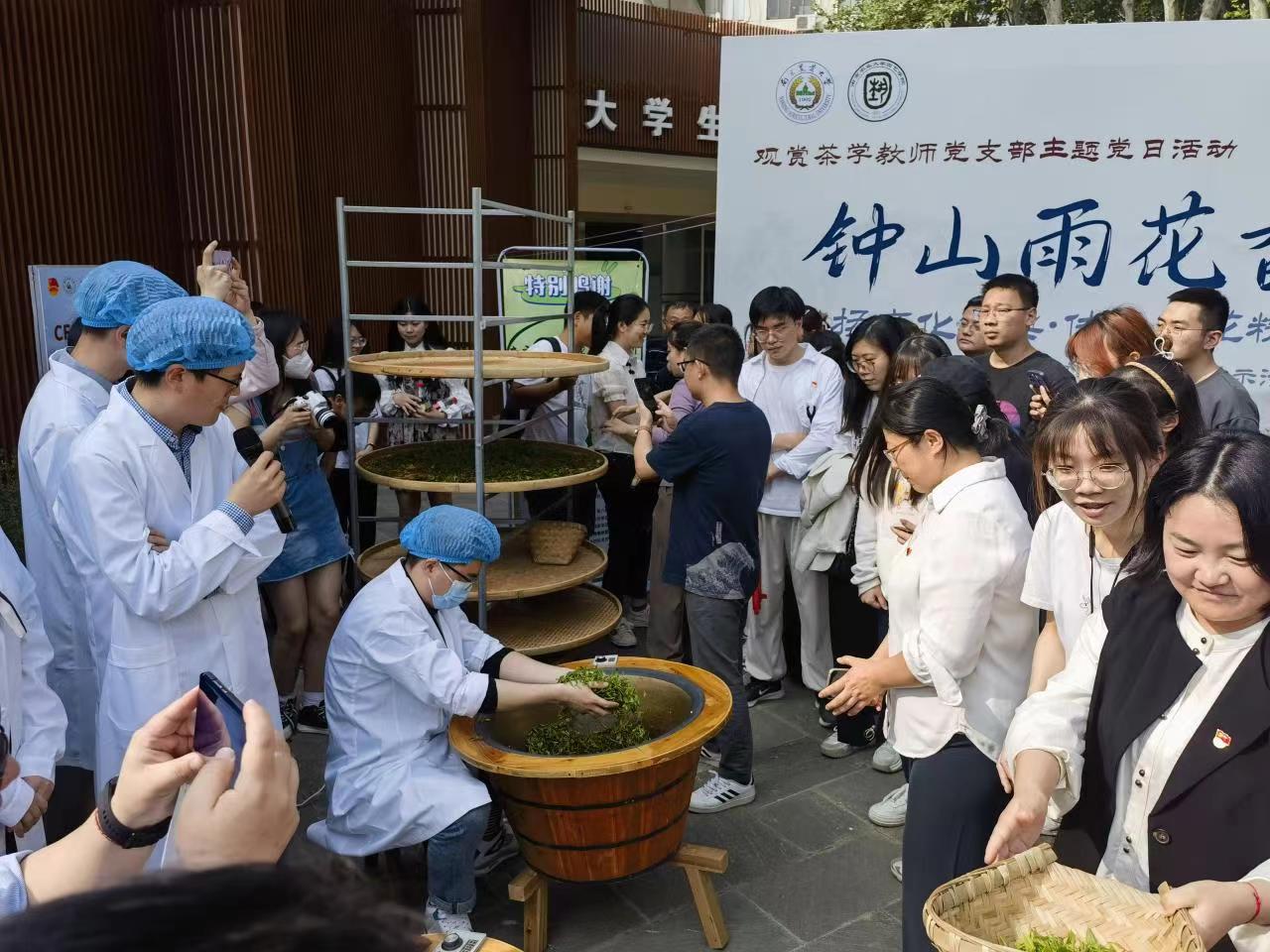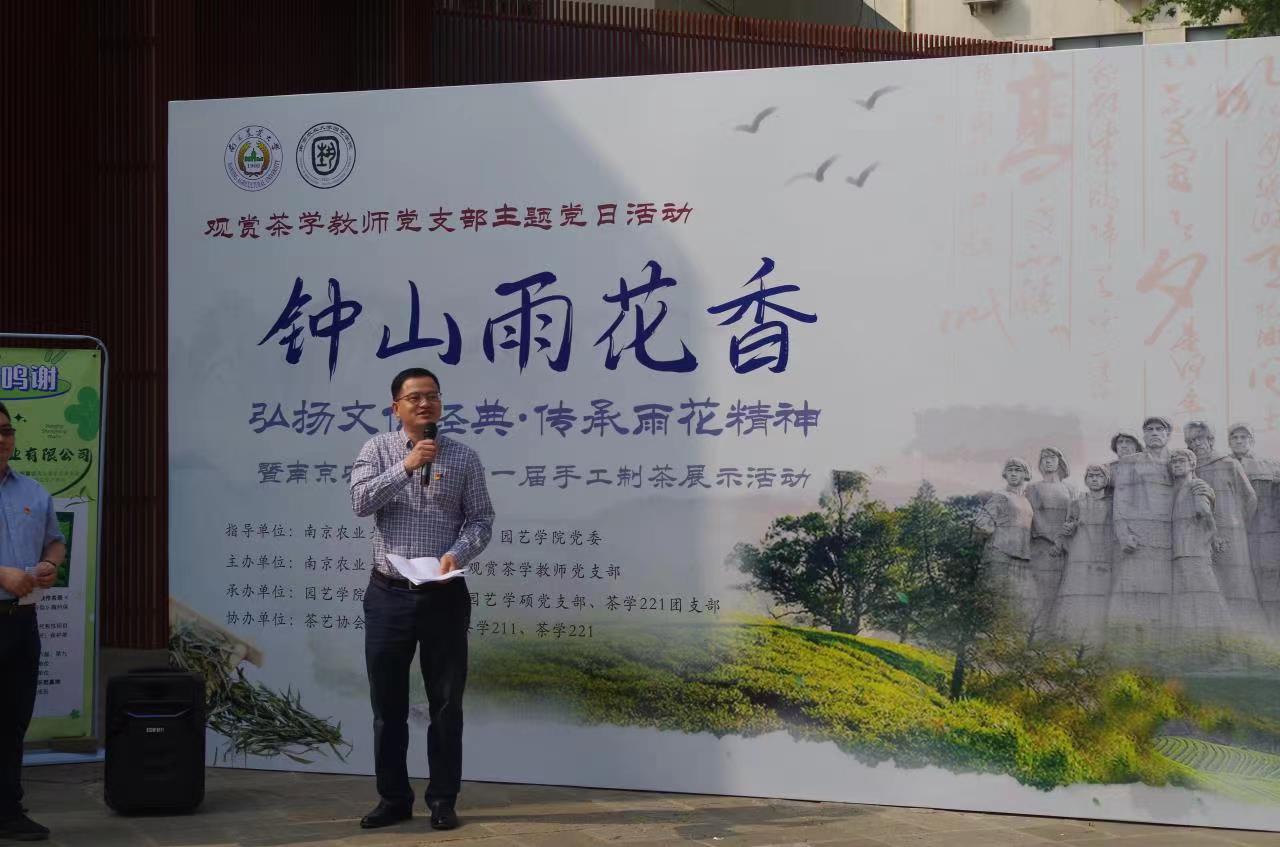 4月19日下午,在南京农业大学党委组织部、304am永利集团官网党委指导下,全国高校首批双带党支部、全国高校样板党支部——观赏茶学专业教师党支部,联合观赏园艺学硕党支部、茶艺协会、茶学专业本科生开展了以“钟山雨花香”弘扬茶文化、传承雨花精神为主题的党日活动暨南京农业大学第一届手工制茶展示活动。活动涵盖传统雨花茶制茶技艺展示、手工制茶体验、深加工产品展示和茶文化知识科普竞答四个部分。校党委副书记刘营军出席活动,学工处、校团委、园艺院相关负责同志,江苏省教育厅电化教育馆相关工作人员,观赏茶学教师党支部党员教师、观赏园艺学硕党支部和茶学专业团支部同学参加。