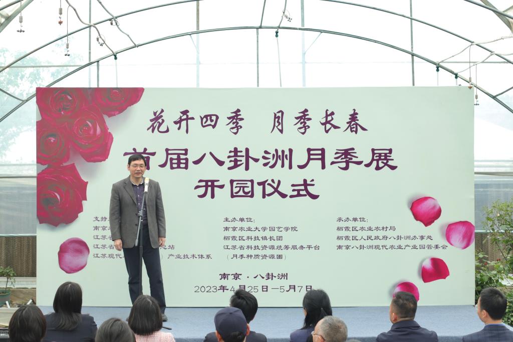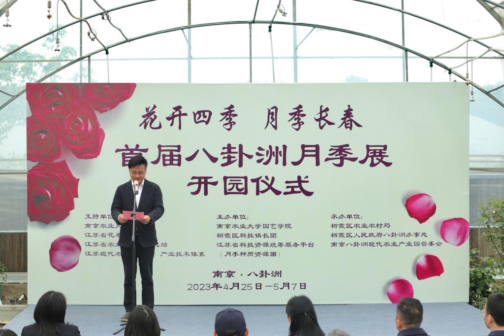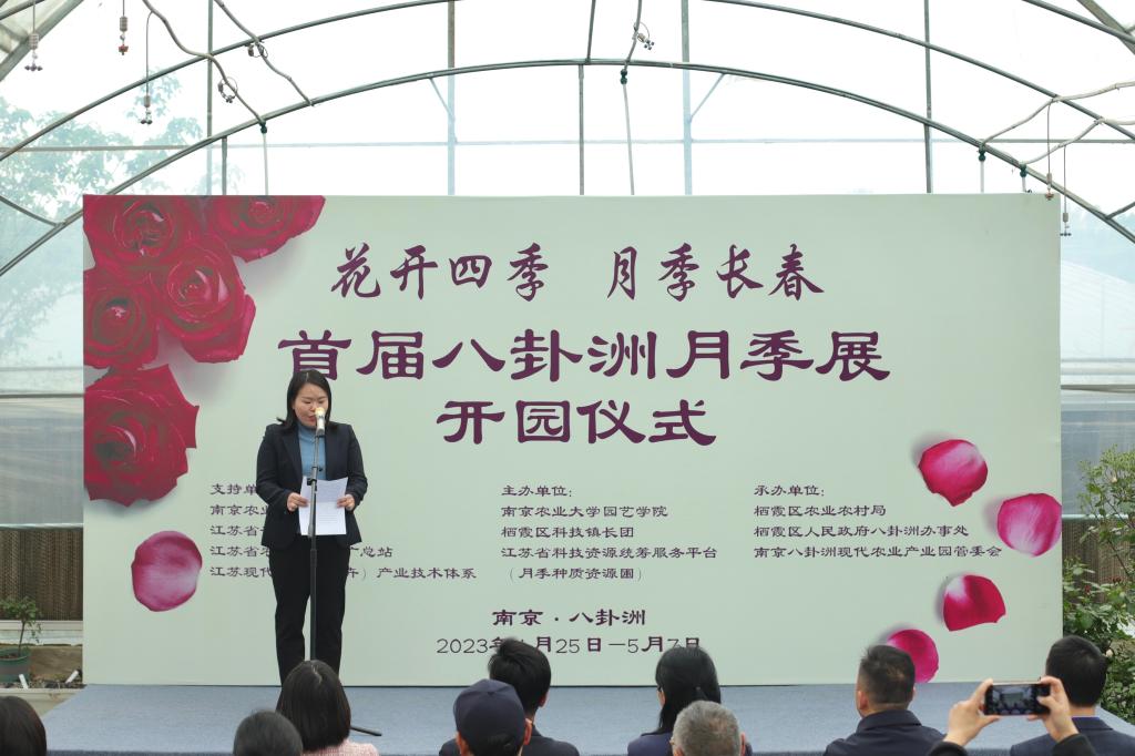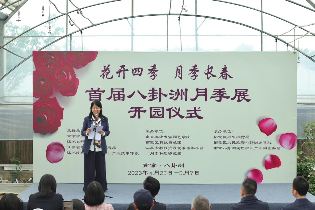 陈素梅院长代表304am永利集团官网对莅临月季展的各位领导与嘉宾表示热烈的欢迎。在介绍了南京农业大学及304am永利集团官网的基本概况后,陈院长表示此次展览不仅仅是304am永利集团官网月季团队和基地的成果展,也是栖霞区科技镇长团和栖霞区八卦洲街道乡村振兴工作的阶段性呈现。并希望月季团队能以此次展览为契机,“以花为媒”,汇聚各方智力、凝聚多方力量,推动科技创新,不断产出顶天立地的成果,服务农业强国与乡村振兴;继而以此次展览为新起点,躬耕不辍,着力推进农业与旅游、教育、文化与产业的深度融合,打造宜居宜业美丽乡村,打造八卦洲乡村旅游新地标。并预祝本次展览取得圆满成功。