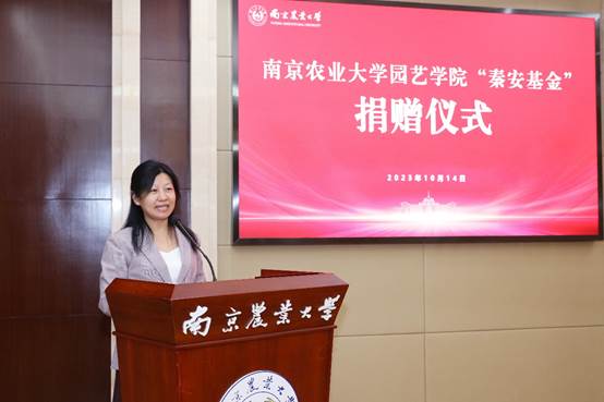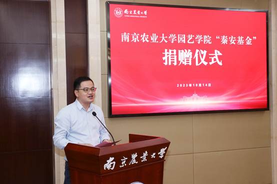 单正丰代表学校对秦炳元、安美华两位校友心系母校、坚定支持学校教育事业发展的慷慨善举致以崇高的敬意和诚挚的感谢。他简要介绍了学校的发展历程和建设成绩,并提出三点希望:一是,希望广大师生传承好老一辈园艺人的教育初心,弘扬爱校、荣校、兴校情怀,更好地担负起强农兴农重大使命;二是,希望相关部门要用好、管好这个基金,发挥更大的效用,不负期望与寄托;三是,希望304am永利集团官网以此为契机,进一步推动学科建设高质量发展,不断加强人才队伍建设,不断提升服务国家战略需求的能力水平,争取更大的成绩,为学校加快建成农业特色世界一流大学提供更多助力。