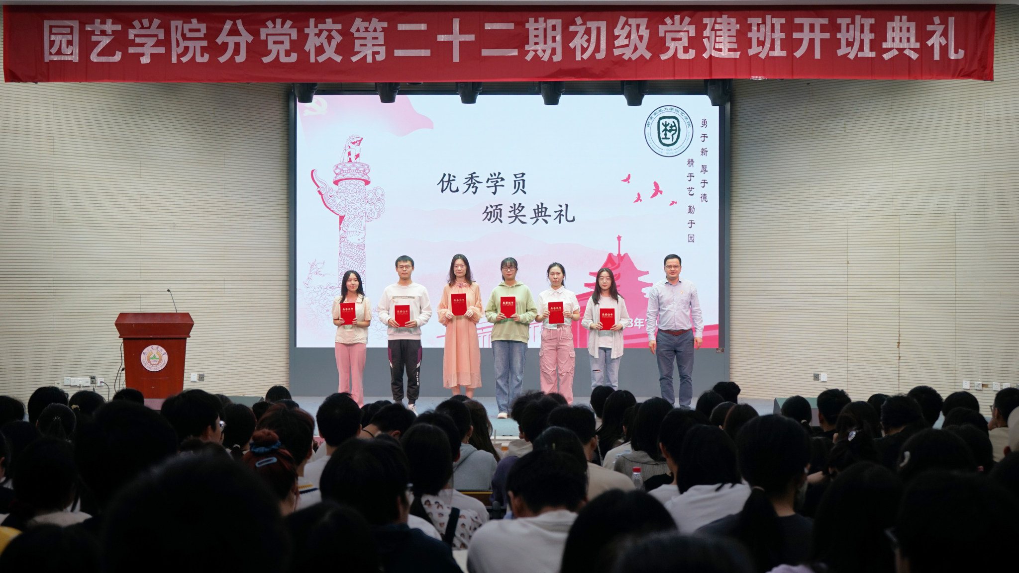在过去的一年里,第二十一期初级党建班系列活动如火如荼地开展,学员积极参与各项学习与活动,涌现出了一批表现突出的学员,窦靓宣读了表彰决定,韩健为优秀学员颁发证书。崔洋和鲁月分别介绍了第二十二期党建班课程概况和负责人职责,对参训的学员和各负责人提出了要求,勉励他们在思想上和行动上不断向党组织靠拢。刘圆晴和陈凤佳同学分别代表优秀学员和新学员发言,发出了园艺青年立志将青春梦与中国梦结合、将个人发展融入时代潮流的声音。