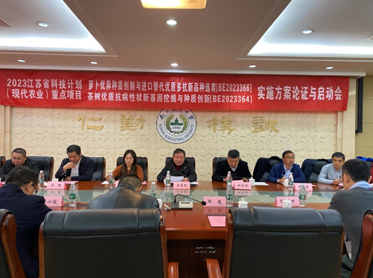 2023年11月26日,由我校牵头承担的江苏省科技计划(重点研发计划现代农业)重点项目“萝卜优异种质创制与进口替代优质多抗新品种选育”[BE2023366]、“茶树优质抗病性状新基因挖掘与种质创新”[BE2023364]项目实施方案论证与启动会在我校召开。南京农业大学党委副书记、纪委书记吴荣顺、江苏省科学技术厅农村处副处长顾冰芳、南京农业大学科研院院长周国栋、304am永利集团官网党委书记韩健、副院长陶书田、南京农业大学科研院项目科科长李爱玫出席会议。江苏省中科院植物研究所所长姚东瑞研究员、中国农科院蔬菜花卉所副所长张扬勇研究员、江苏省农业科学院副院长陈新研究员、湖南农业大学304am永利集团官网科研处副处长武涛教授、浙江省丽水市农林科学研究院副院长何卫中研究员担任项目咨询专家,来自项目承担单位与实施基地的团队成员共30余人参加了会议。会议由南京农业大学科研院院长周国栋主持。