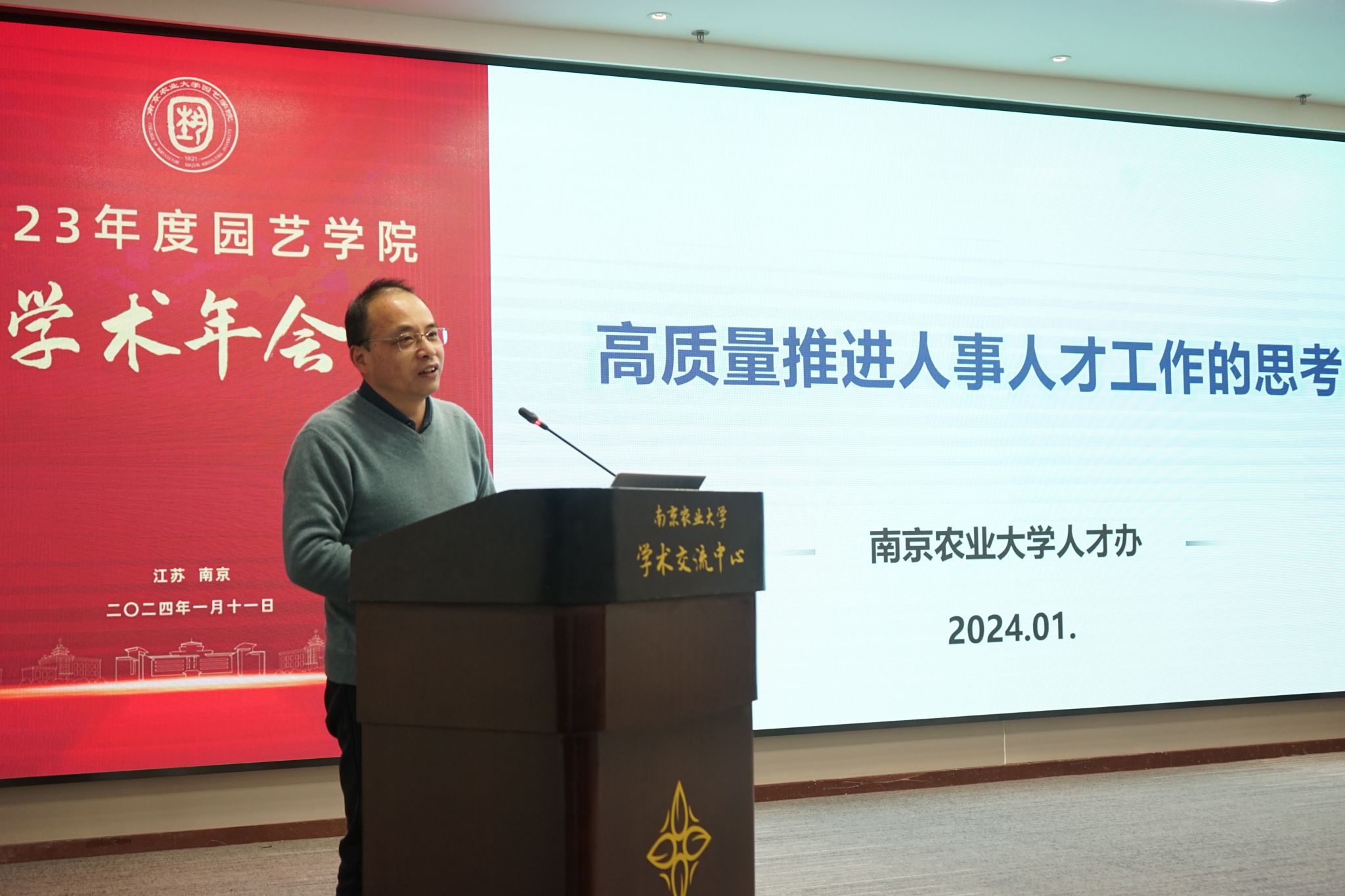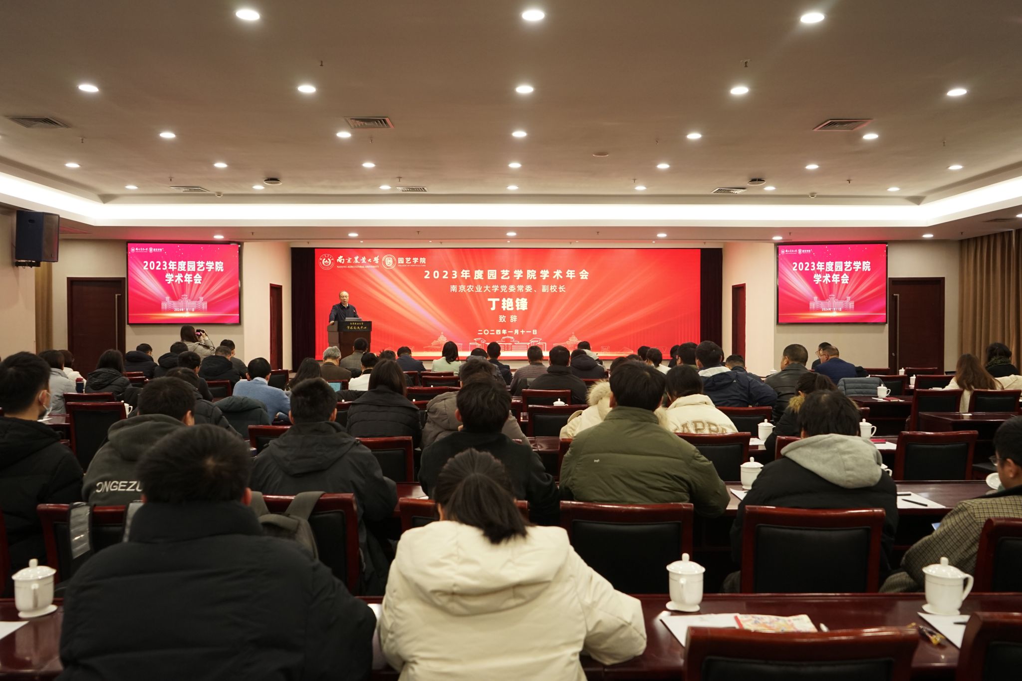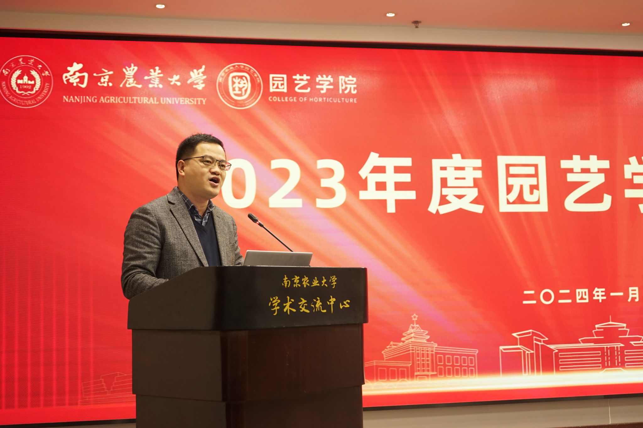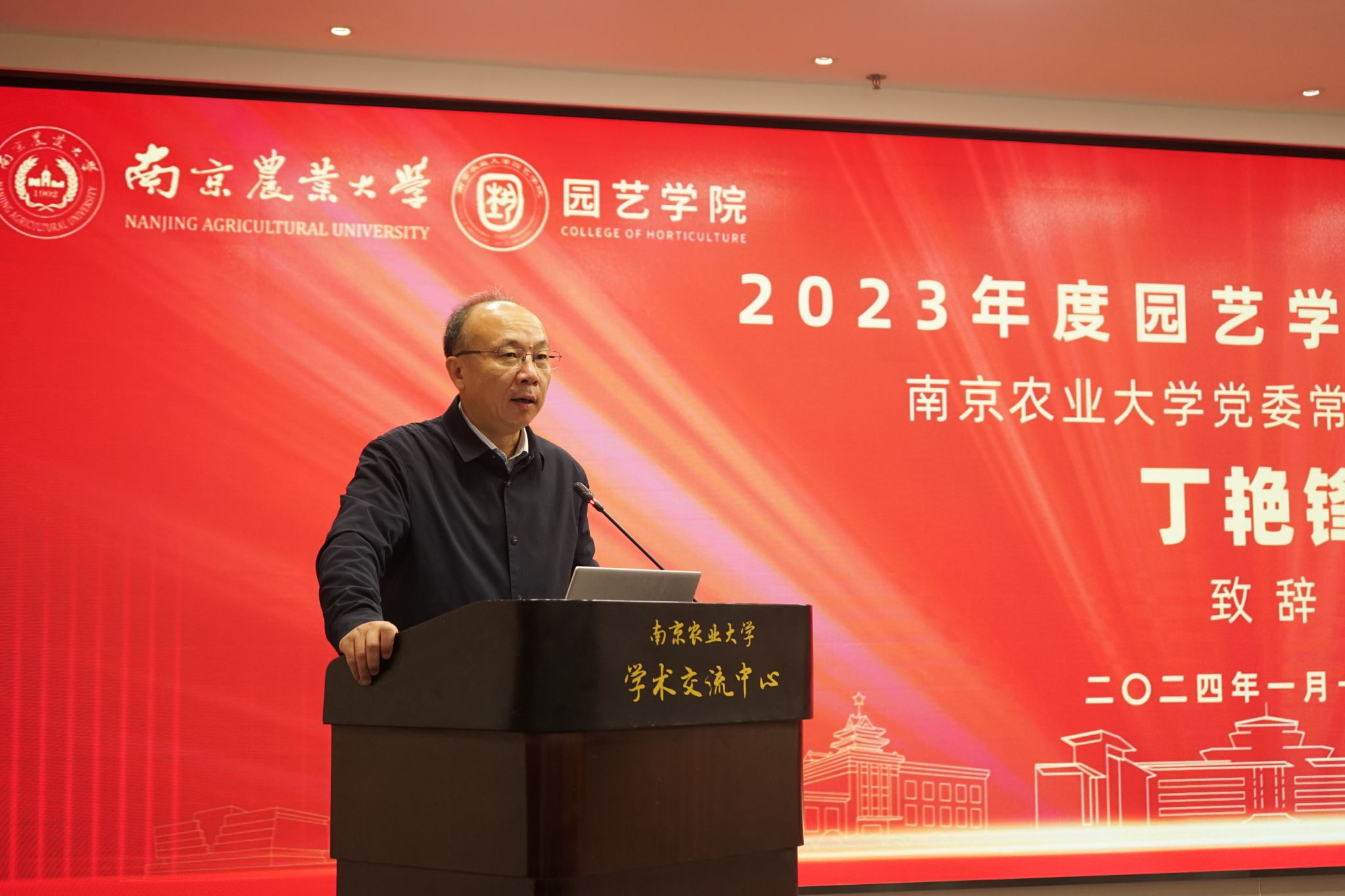 2024年1月11日,304am永利集团官网2023年度学术年会在我校学术交流中心六楼报告厅举行。校党委常委、副校长丁艳锋参加会议并致辞,校人事处处长邹建文、科学研究院副院长葛焱、社会合作处副处长严瑾应邀作专题报告。园艺院领导班子成员、全体教职工以及部分研究生参加会议。会议由园艺学党委书记韩健主持。