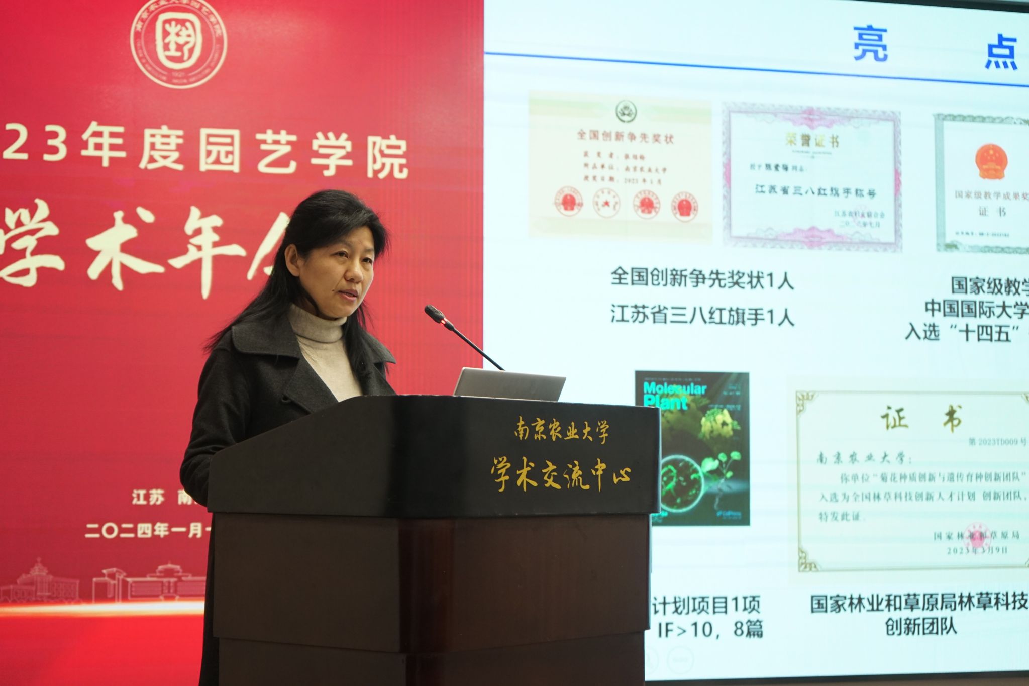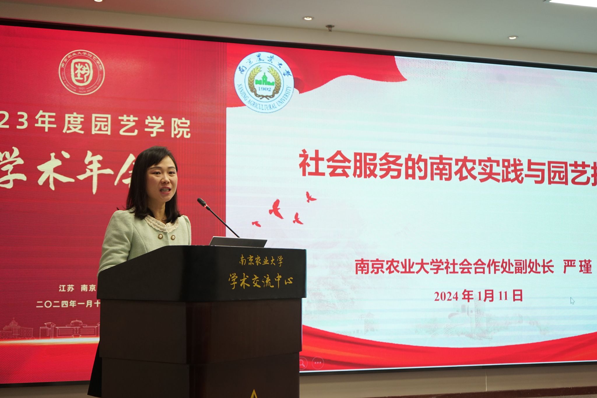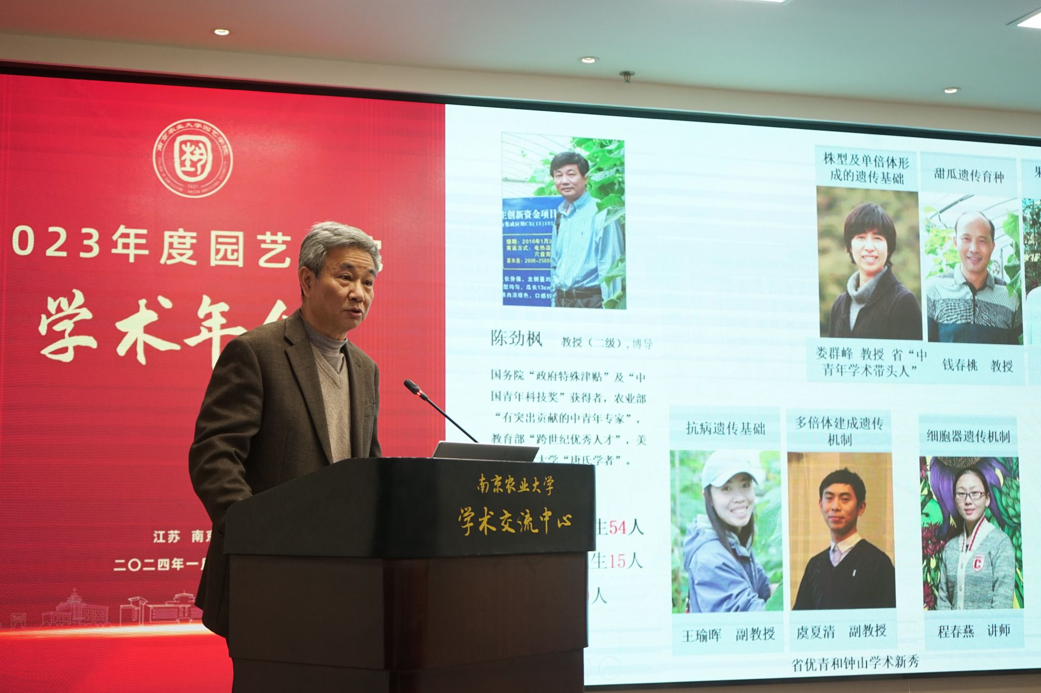 2024年1月11日,304am永利集团官网2023年度学术年会在我校学术交流中心六楼报告厅举行。校党委常委、副校长丁艳锋参加会议并致辞,校人事处处长邹建文、科学研究院副院长葛焱、社会合作处副处长严瑾应邀作专题报告。园艺院领导班子成员、全体教职工以及部分研究生参加会议。会议由园艺学党委书记韩健主持。