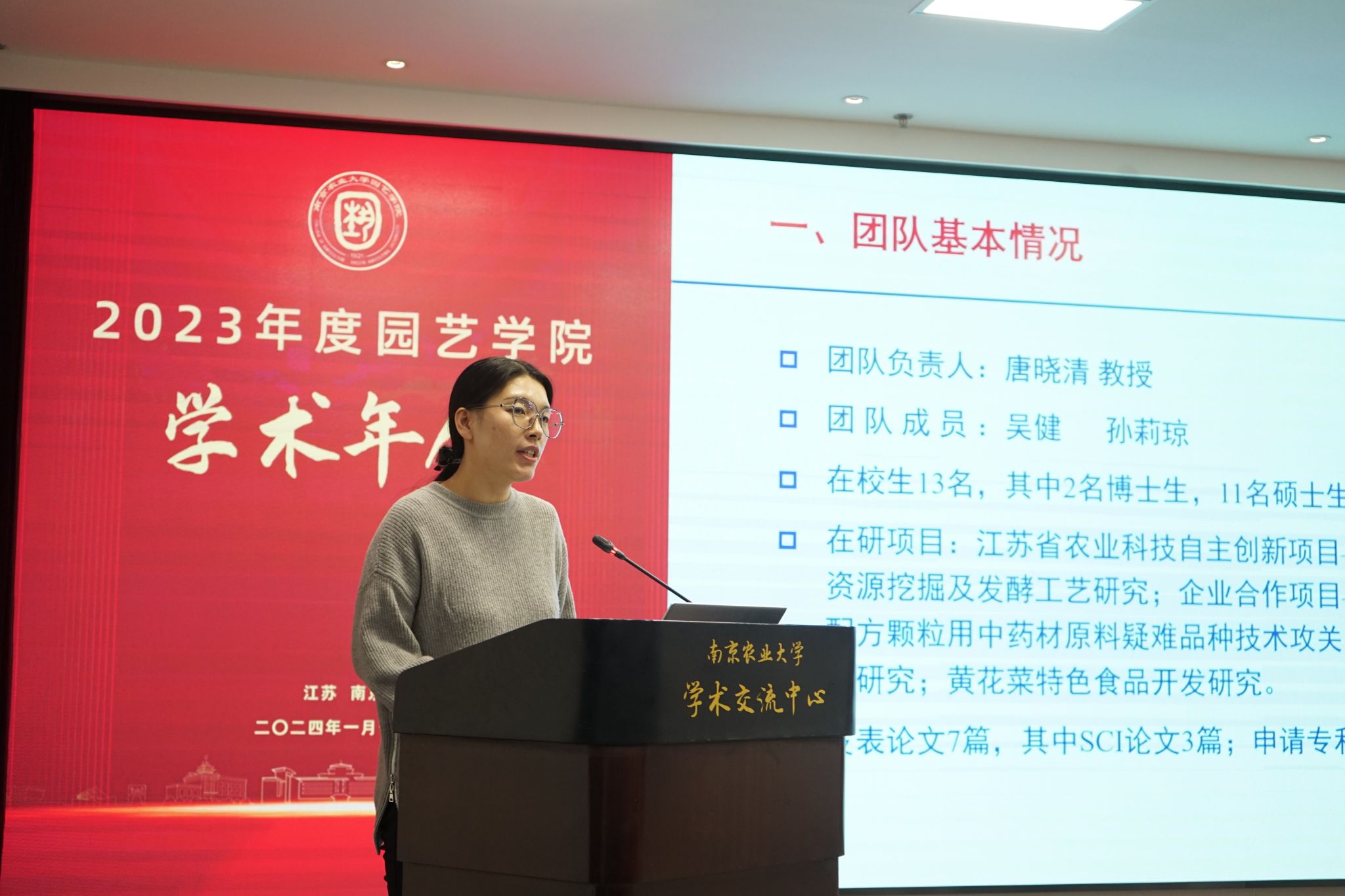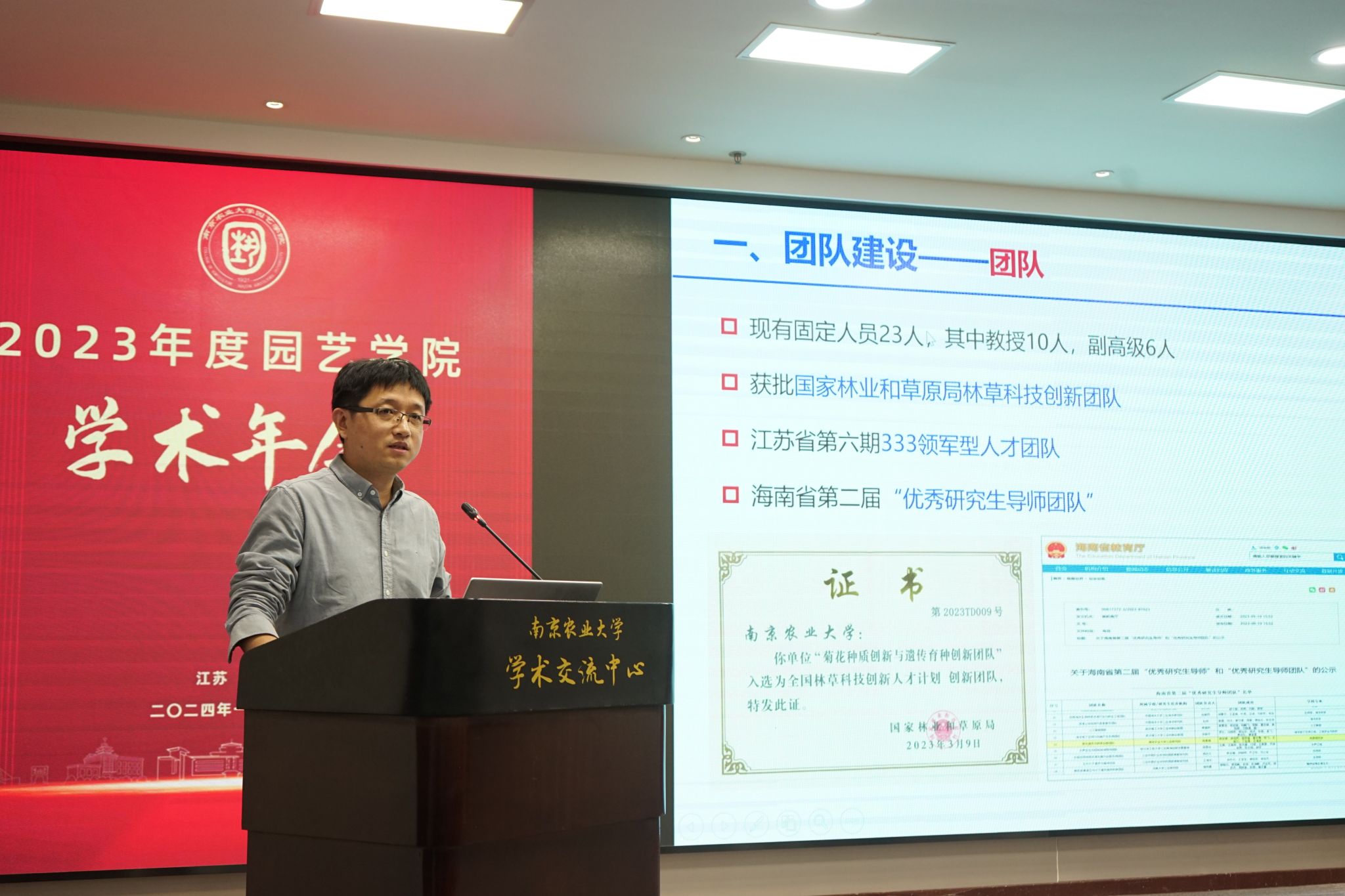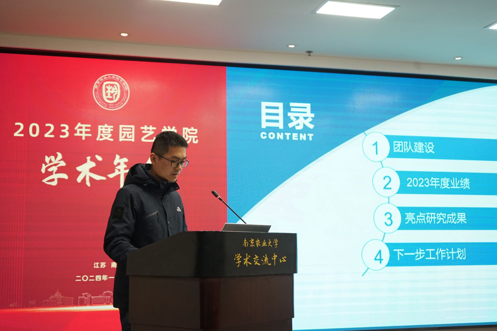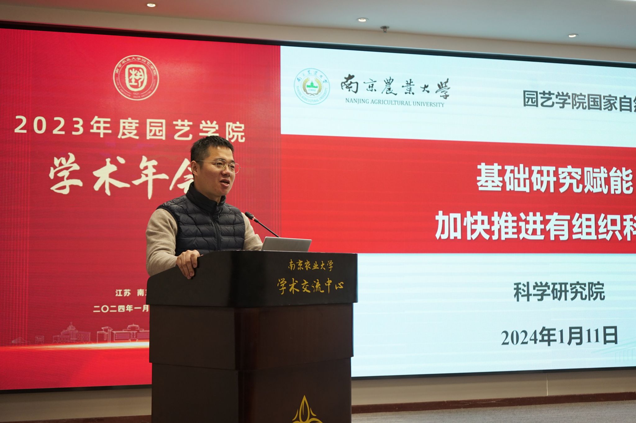 2024年1月11日,304am永利集团官网2023年度学术年会在我校学术交流中心六楼报告厅举行。校党委常委、副校长丁艳锋参加会议并致辞,校人事处处长邹建文、科学研究院副院长葛焱、社会合作处副处长严瑾应邀作专题报告。园艺院领导班子成员、全体教职工以及部分研究生参加会议。会议由园艺学党委书记韩健主持。
