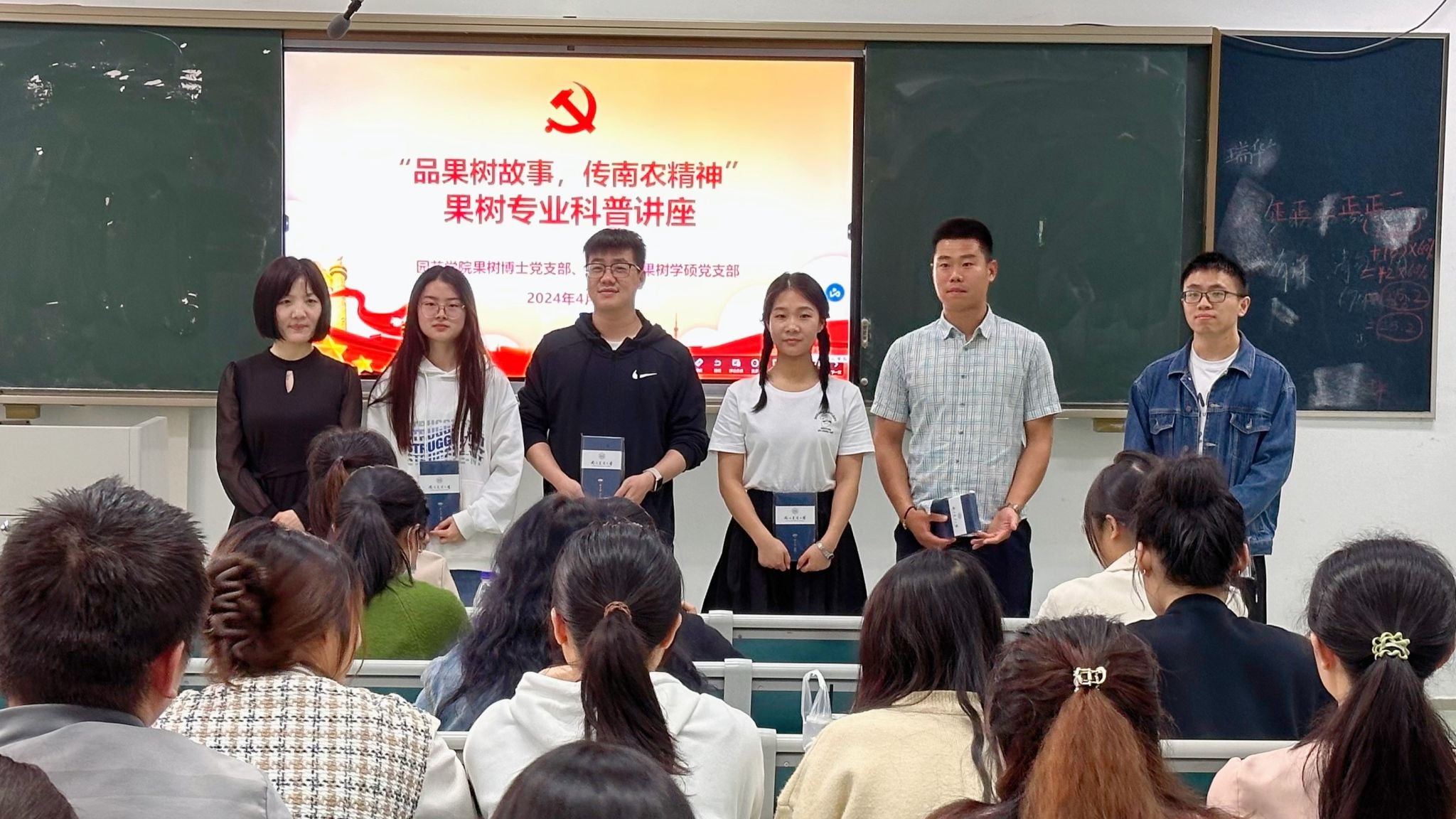 在活动中,师生党员们积极参与讨论和提问,展现了对果树专业的浓厚兴趣和积极态度。活动最后总结表彰环节,果树博士党支部书记王晨老师向四位讲座科普主讲人表示感谢,并颁发纪念品,果树学硕党支部书记侍婷老师为积极参与交流提问的同志们颁发纪念品。