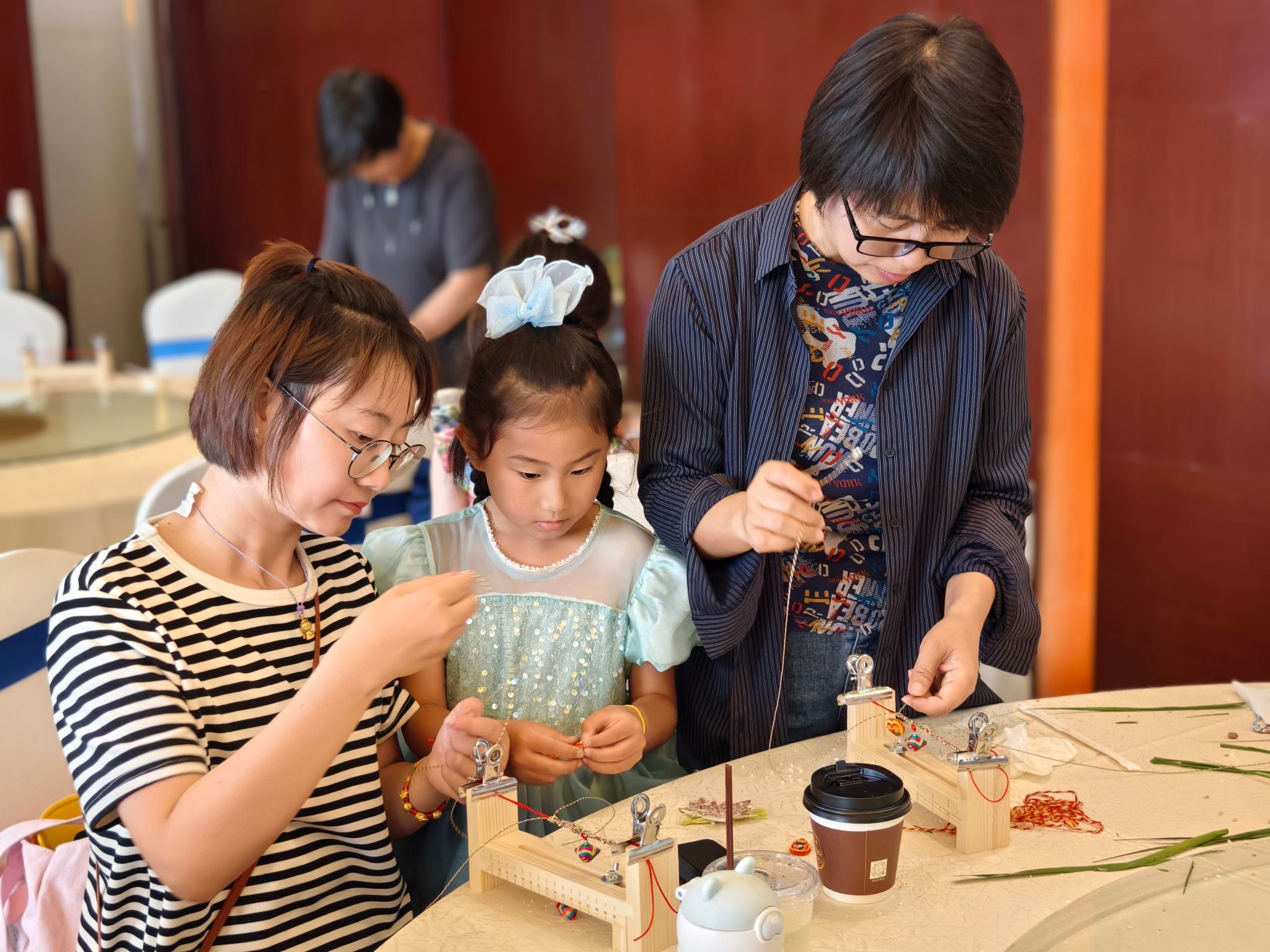 在包粽子环节,翰苑紫金厅内弥漫着粽叶的清香和大家的欢声笑语。教职工与孩子们围坐在一起,共同包粽子,交流心得,享受这难得的亲子时光。同时,传统漆扇和编手绳的制作区域也吸引了众多小朋友的目光。他们在家长和小伙伴们的指导下,认真学习,亲手制作出了一件件属于自己的、独一无二的精美手工艺品。