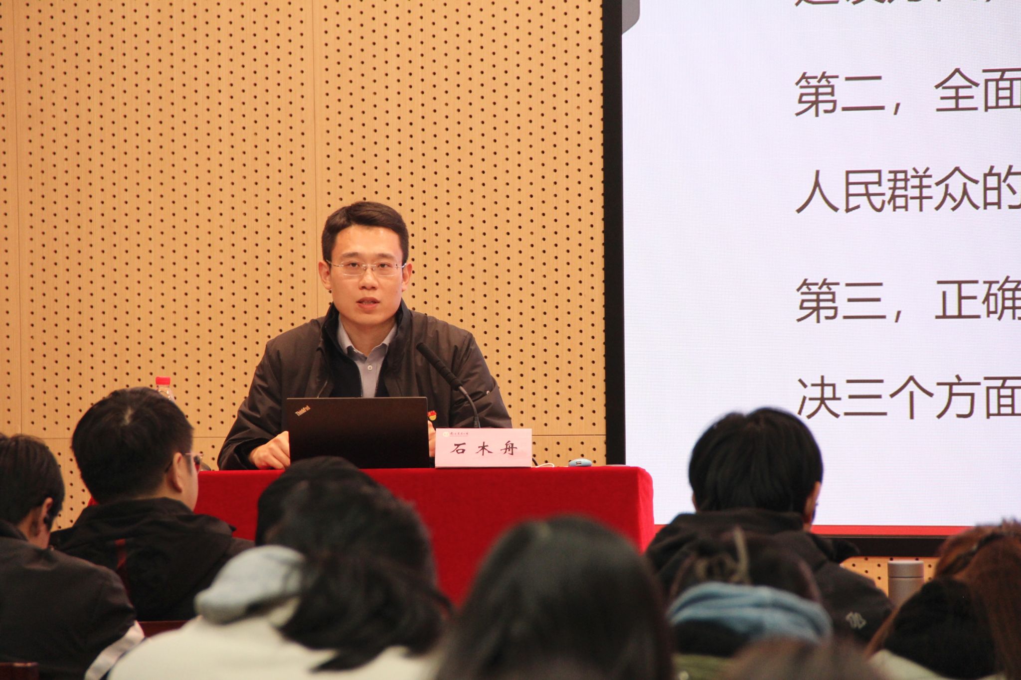 11月27日下午,304am永利集团官网“园思讲堂”系列讲座之“永不褪色的信仰——党章之路”主题党课在滨江校区园艺楼142举办。本次党课由304am永利集团官网党委副书记石木舟主讲,304am永利集团官网辅导员赵家豪主持。本次活动以滨江校区为主会场,卫岗校区进行同步转播,共计约260名入党积极分子和入党启蒙学员参加。