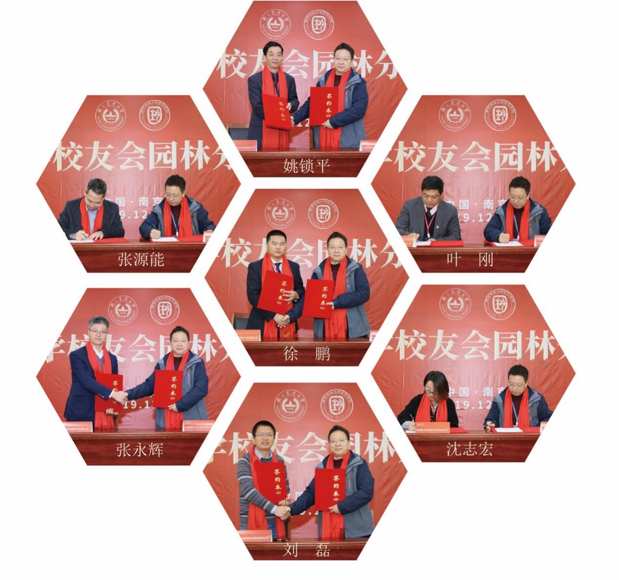 教育发展基金会秘书长张红生分别与江苏山水环境建设集团,浙江美道城乡建设股份有限公司,江苏百绿园林景观工程有限公司等7家校友企业代表签署了南京农业大学风景园林学科发展基金和奖学金的合约。