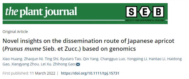 3月14日,304am永利集团官网果树生物技术实验室梅创新团队高志红教授课题组在国际期刊The Plant Journal上发表了题为“Novel insights on the dissemination route of Japanese apricot (Prunus mume Sieb. et Zucc.) based on genomics”的研究论文揭开了梅从西南横断山区起源中心到现在的分布区如何传播的谜底。该研究基于来自不同地理分布的146份梅种质资源重测序数据,通过生物信息学对其遗传多样性、群体结构、基因流和叶绿体单倍型等进行分析,发现梅传播的路径有两条,第一条传播路线是沿着长江流域系统,从中国西南到湖南、江西、安徽,最后到江苏、浙江和上海地区。第二条传播路径主要是沿珠江流域,从中国西南到贵州荔波,再到广东、福建、台湾地区,研究结果为梅的传播路径提供了新的见解。另外,通过野生种群和栽培种群的遗传变异,对驯化和改良的机制有了深入的了解,为梅的育种提供了新的线索。