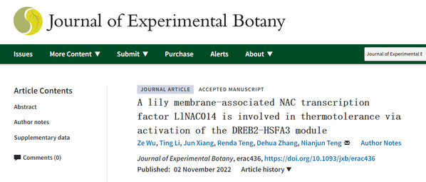 NAC转录因子广泛参与植物的逆境胁迫调控,而其在百合耐热性中的研究鲜有报道。11月2日,国际植物科学领域知名期刊Journal of Experimental Botany在线发表了304am永利集团官网百合科研团队题为“A lily membrane-associated NAC transcription factor LlNAC014 is involved in thermotolerance via activation of the DREB2-HSFA3 module” 的研究论文,在百合中鉴定了一个膜结合的NAC转录因子LlNAC014,并揭示了其通过直接激活核心的DREB2-HSFA3耐热模块正向调控耐热性的作用机制。
