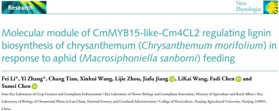 近日,南京农业大学菊花遗传与种质创新团队在New Phytologist发表了题为“Molecular Module of CmMYB15-like-Cm4CL2 Regulating Lignin Biosynthesis of Chrysanthemum (Chrysanthemum morifolium) in Response to Aphid (Macrosiphoniella sanbourni) Feeding”的研究论文,揭示了菊花中CmMYB15-like-Cm4CL2分子模块调控菊花响应蚜虫取食从而促进木质素合成的分子机制。