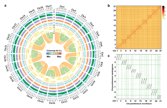 团队前期与中国中医研究院等单位合作完成了菊花基因组潜在供体--菊花脑(Chrysanthemum nankingense)全基因组的组装,公开了首个菊属植物基因组(Molecular Plant, 2018);但由于菊花为六倍体(2n = 6x = 54),基因组巨大(~9 Gb)、具有高重复(>80%)、高杂合(>3%)的特点,且经过人工反复杂交选育,导致其基因组组装难度大,一直未被解析。针对以上难点,团队首先通过花粉蒙导法获得了园林小菊‘钟山紫桂’的单倍体植株(n = 3x = 27),而后采用PacBio三代超长序列(120.70×),结合Illumina二代数据(126.4×)和10XGenomics(107.20×)数据校正,组装出8.15 Gb的菊花基因组,并基于HiC(118.50×)数据将96.46%的基因组序列挂载到菊花27条染色体上。基因组contig N50达到1.87Mb,经LAI(27.99)评估达到gold级别。进一步通过整合从头预测、同源预测和转录数据,注释出138,749个蛋白编码基因,最终获得了菊花染色体级别的高质量参考基因组。另外,我们重新测序并组装了染色体水平的菊花脑基因组(3.09 Gb),其与菊花基因组的共线性分析呈清晰的1:3关系(图1)。