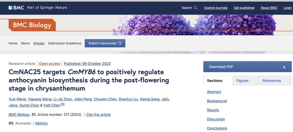 10月9日,南京农业大学陈发棣教授团队在生物学领域经典期刊BMC Biology上发表了题为“CmNAC25 targets CmMYB6 to positively regulate anthocyanin biosynthesis during the post-flowering stage in chrysanthemum”的研究论文。阐明了NAC转录因子CmNAC25参与调控菊花衰老过程中花青苷积累的分子机制。