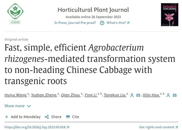 近日,Horticultural Plant Journal在线发表了南京农业大学侯喜林团队题为“发根农杆菌介导的快速、简单、高效的不结球白菜转基因根系转化方法”的研究论文。
