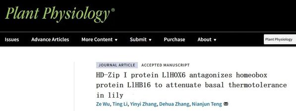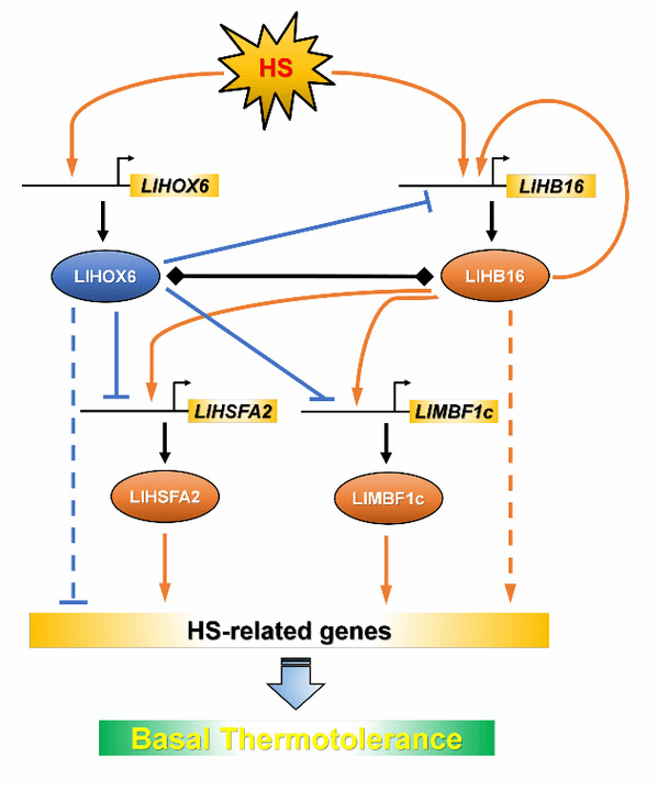 南京农业大学滕年军教授团队近年来在百合耐热性调控机制研究中取得了一系列研究进展,揭示了百合热激转录因子HSFA3通过高温诱导的可变剪接机制精细调控耐热性的机制(Wu et al., 2019, Plant Physiology; 与中国农业大学义鸣放教授合作完成);阐明了百合WRKY39以钙离子依赖的方式与CaM3互作精细调控桥接因子MBF1c的表达正向调控耐热性机制(Ding et al., 2021, Horticulture Research);发现了百合WRKY转录因子WRKY22直接作用于DREB2的上游参与耐热性的调控(Wu et al., 2022, Horticulture Research);在百合中鉴定了MYB305-C3H18-WRKY33功能模块调控耐热性(Wu et al., 2023, Molecular Horticulture);鉴定了一个膜结合的NAC转录因子LlNAC014,其响应高温转移至核内,激活DREB2-HSFA3模块正向调控耐热性(Wu et al., 2023, Journal of Experimental Botany);该篇论文进一步发现百合另一个HD-Zip I成员HOX6与HB16互作,拮抗地调控百合耐热性。基于上述系统的研究,该团队构建了比较完善的百合响应高温胁迫的分子调控网络,将为百合乃至其他农作物耐热性改良提供了重要理论基础。