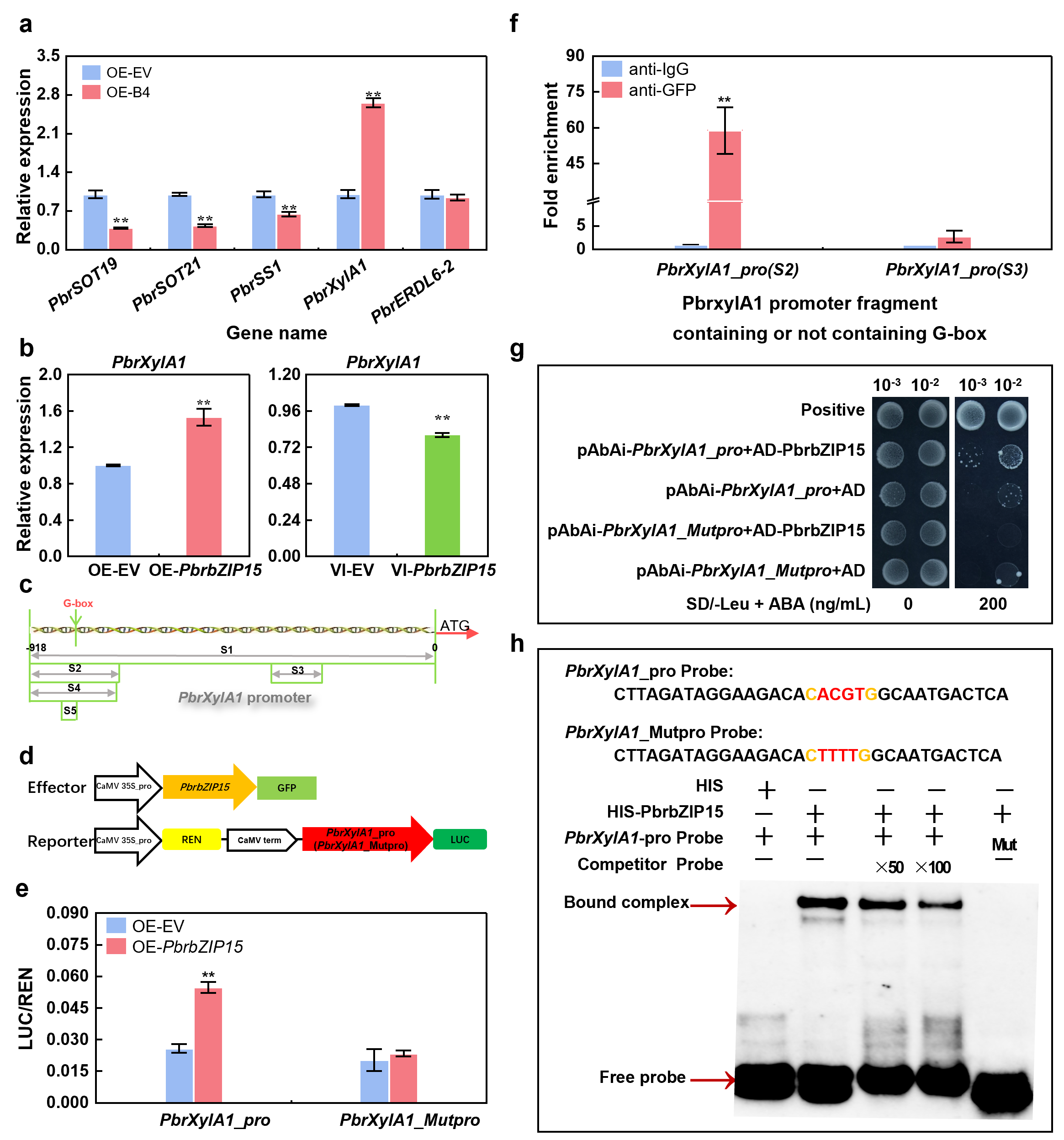 为深入探究PbrbZIP15参与果实糖分积累的调控机制,研究团队对PbrbZIP15与糖代谢及转运相关结构基因进行共表达分析,结合双荧光素酶报告试验、ChIP-qPCR、酵母单杂交以及EMSA试验结果发现:PbrXylA1作为PbrbZIP15的直接下游靶基因,可被PbrbZIP15转录激活。