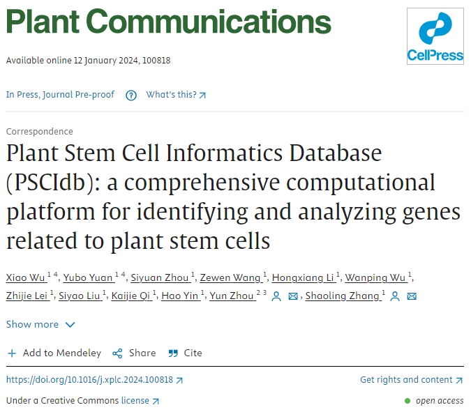 1月12日,南京农业大学张绍铃院士与普渡大学Yun Zhou教授课题组在Plant Communications发表题为Plant Stem Cell Informatics Database(PSCIdb): a comprehensive computational platform for identifying and analyzing genes related to plant stem cells的论文,构建了植物干细胞信息学分析平台PSCIdb(http://www.plantstemcelldb.org.cn),为跨物种干细胞基因比较、功能和进化研究提供重要宝贵的资源。