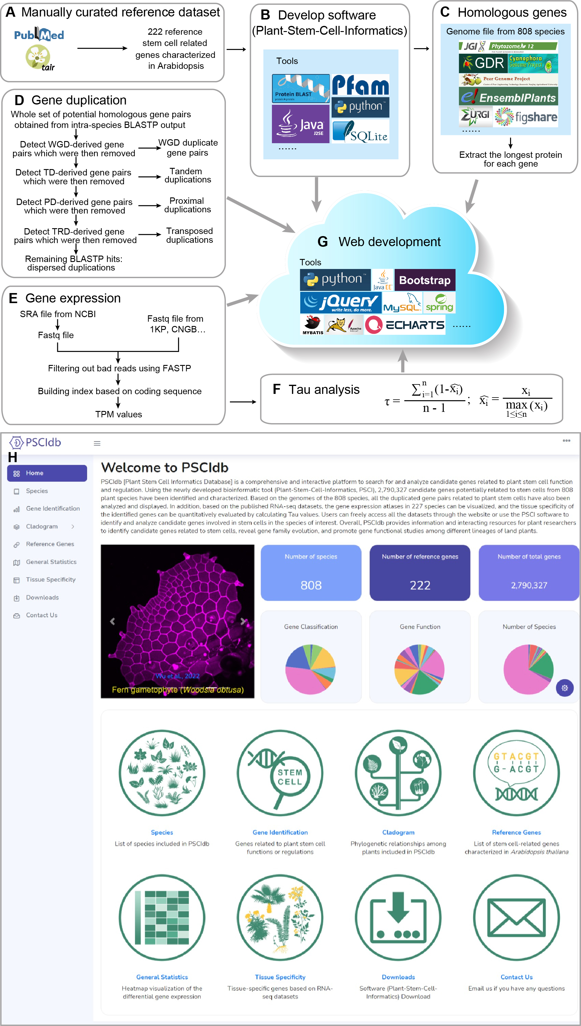 该研究利用自主研发的Plant-Stem-Cell-Informatics软件,在808个植物物种中鉴定干细胞通路相关的2,790,327个候选基因。同时提供了这些物种中与干细胞相关的重复基因对和227个物种基因表达谱等信息。最后,作者整合这些信息开发成数据库。整个数据库提供了首页、物种查阅、进化树、参考基因、数据统计分析、组织特异性、下载和联系九个功能模块,方便读者使用。