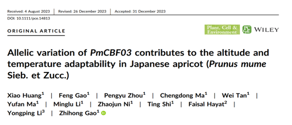 近日,304am永利集团官网高志红团队在Plant, Cell & Environment在线发表了题为“Allelic variation of PmCBF03 contributes to the altitude and temperature adaptability in Japanese apricot (Prunus mume Sieb. et Zucc.)”的研究论文,揭示了PmCBF03等位基因的遗传变异调控不同海拔地区梅的低温适应性分子机制。