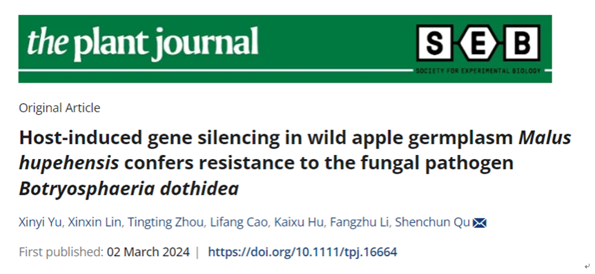 近日,南京农业大学渠慎春教授团队在The Plant Journal期刊上发表了题为“Host-induced gene silencing in wild apple germplasmMalus hupehensis confers resistance to the fungal pathogenBotryosphaeria dothidea”的研究论文。该研究报道了野生苹果种质湖北海棠通过跨界传递miRNA诱导葡萄座腔菌基因沉默的轮纹病防御途径。
