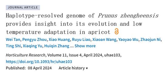 2024年4月,Horticulture Research 在线发表了南京农业大学等单位合作完成的题为Haplotype-resolved genome of Prunus zhengheensis provides insight into its evolution and low temperature adaptation in apricot 的研究论文,主要报道了政和杏染色体级别的单倍型基因组基因组组装结果,并进行了杏低温适应性研究。