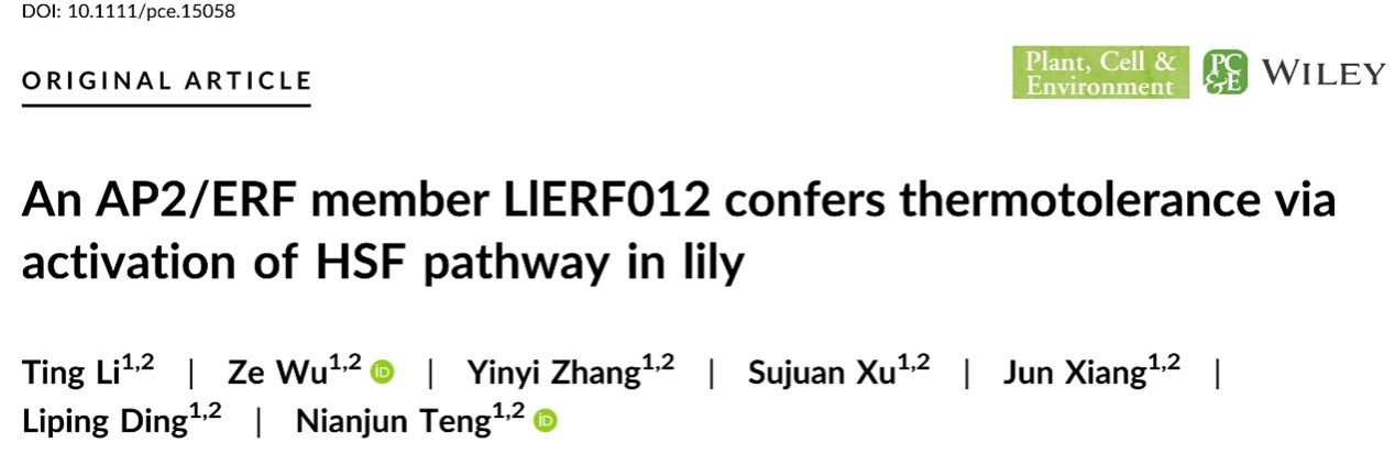南京农业大学百合科研团队博士生李婷、吴泽副教授是Plant, Cell and Environment论文的共同第一作者,滕年军教授为通讯作者,团队成员钟山青年研究员徐素娟博士,博士生向均和丁利平,以及硕士生章茵艺参与了该研究。本研究得到了江苏省高校优势学科项目、江苏省种业振兴“JBGS”项目(JBGS[2021]093)、江苏省农作物种质资源保护项目(2021‐SJ‐011)和江苏省现代农业产业技术体系(JATS [2023]007)资金的支持。