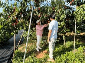 调研组首先深入桃示范基地实地调研。基地主任杨勇详细介绍了基地果园管理及本地水蜜桃产业发展情况,江苏省桃产业技术体系岗位专家,支部书记高志红教授对果园水肥管理到位、树体长势良好表示肯定。同时,针对会影响果实品质的枝梢修剪和生草管理等技术开展田间指导,现场示范如何整形修剪,并对镇江农科院选育的桃新品种给予了高度评价。